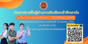 ประกาศรายชื่อผู้ผ่านการคัดเลือกเข้าศึกษาต่อ ปวช.โควตา 2569