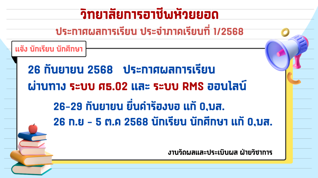 ประกาศผลการเรียน ประจำภาคเรียนที่ 1/256826 กันยายน 2568