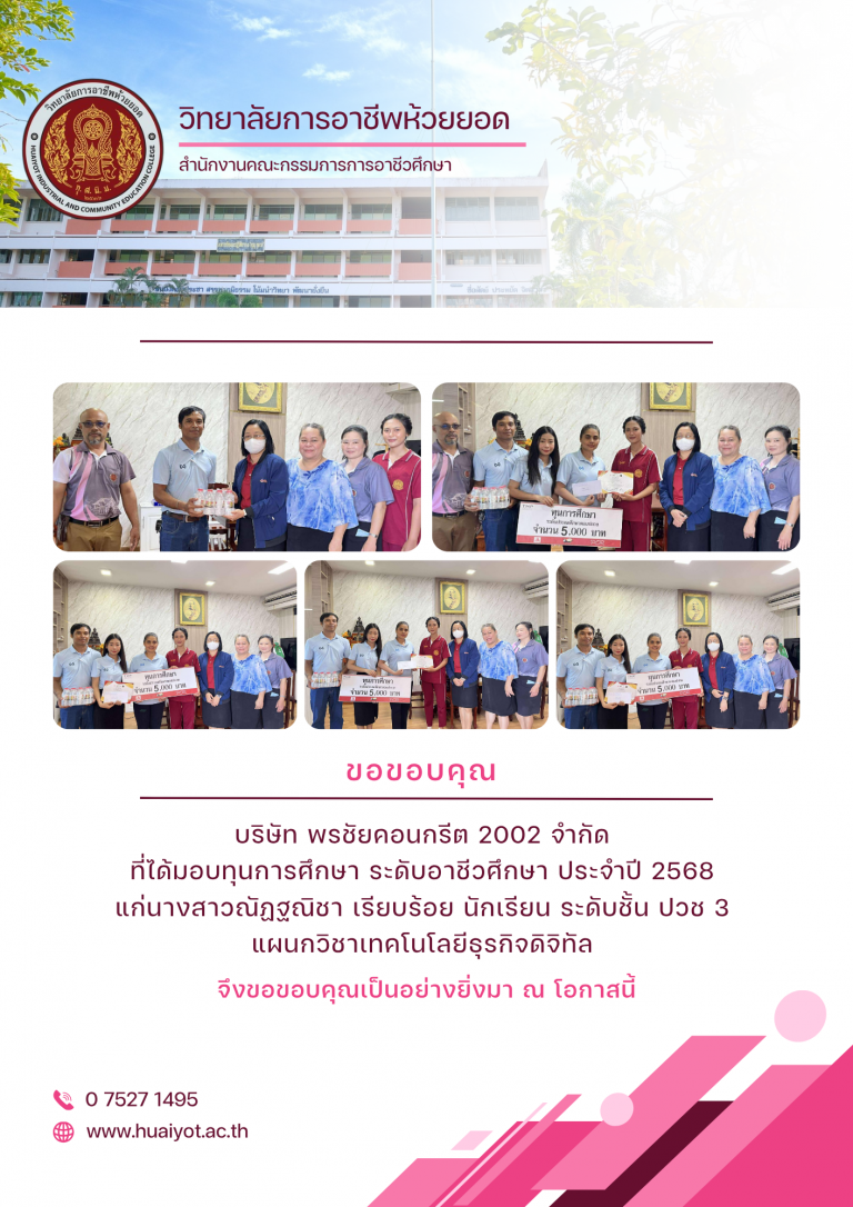 ขอขอบคุณ บริษัท พรชัยคอนกรีต2002 จำกัด มอบทุนการศึกษาให้แก่นักเรียน จำนวน 5,000 บาท