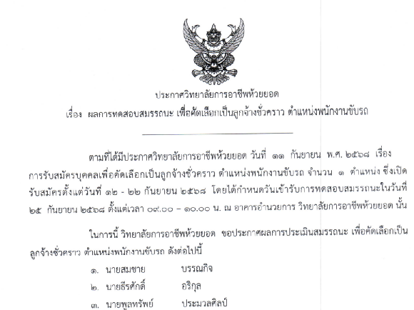 ประกาศวิทยาลัยการอาชีพห้วยยอด เรื่อง ผลการทดสอบสมรรถนะ เพื่อคัดเลือกเป็นลูกจ้างชั่วคราว ตำแหน่งพนักงานขับรถ