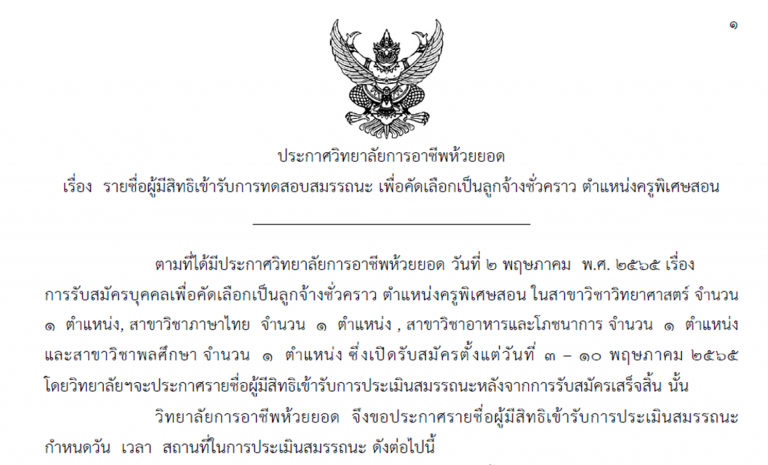 รายชื่อผู้มีสิทธิเข้ารับการทดสอบสมรรถนะ เพื่อคัดเลือกเป็นลูกจ้างชั่วคราว ตำแหน่งครูพิเศษสอน