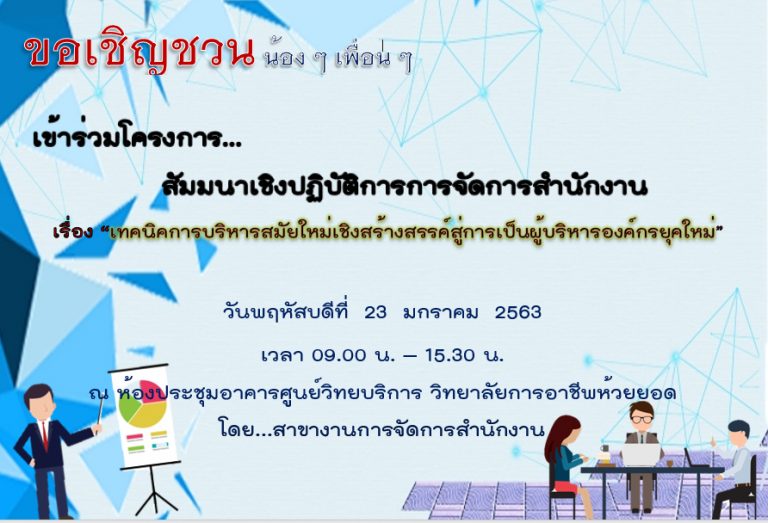 ขอเชิญชวน น้อง ๆ เพื่อน ๆ เข้าร่วมโครงการ… สัมมนาเชิงปฏิบัติการการจัดการสำนักงาน แผนกวิชาเลขานุการ