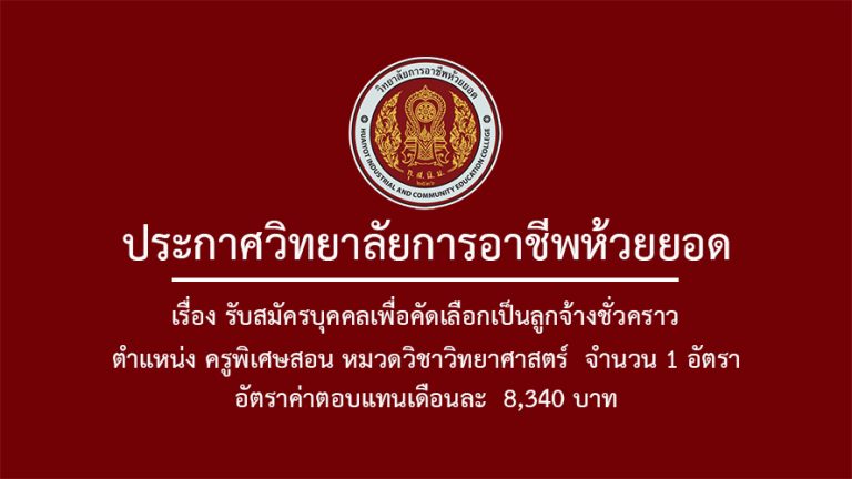 รับสมัครบุคคลเพื่อสอบคัดเลือกเป็นลูกจ้างชั่วคราว ตำแหน่ง ครูพิเศษสอน หมวดวิชาวิทยาศาสตร์ จำนวน 1 อัตรา