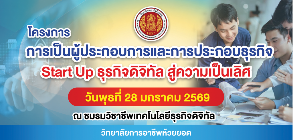 ชมรมวิชาชีพเทคโนโลยีธุรกิจดิจิทัลได้จัด “โครงการ การเป็นผู้ประกอบการและการประกอบธุรกิจ Start Up ธุรกิจดิจิทัล สู่ความเป็นเลิศ”วันพุธที่ 28 มกราคม 2569ณ ชมรมวิชาชีพ แผนกเทคโนโลยีธุรกิจดิจิทัลชั้น 4 ห้อง 641 – 643 เวลา 14.30 – 16.30 น.