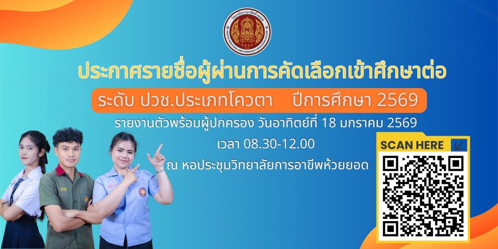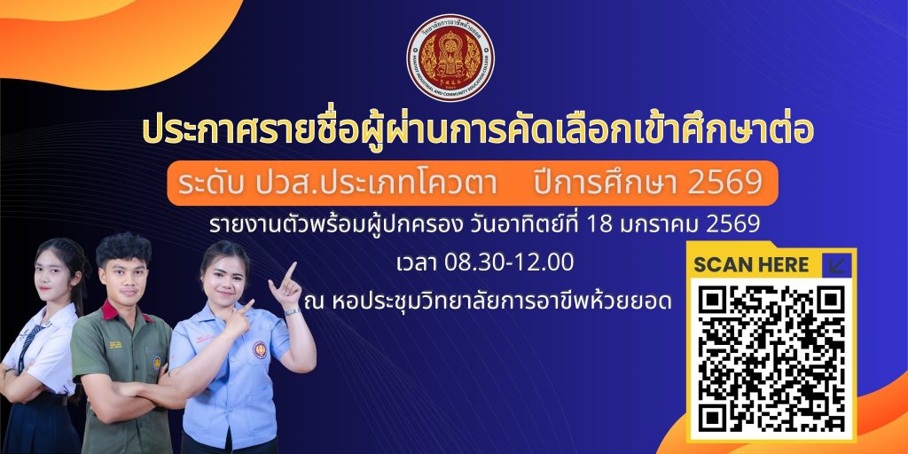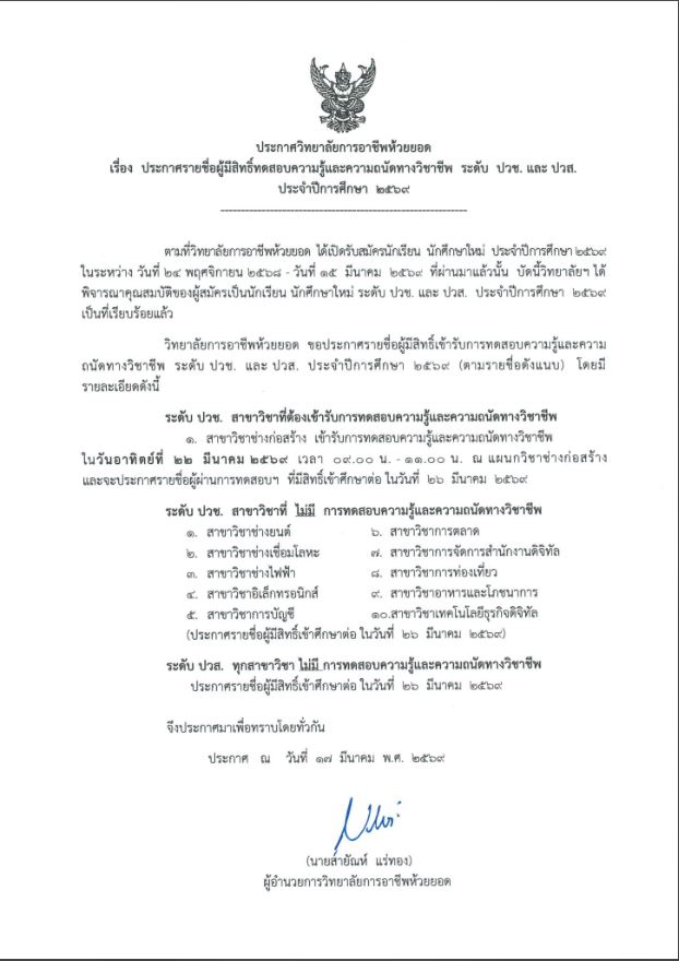 ประกาศรายชื่อผู้มีสิทธิ์ทดสอบความรู้และความถนัดทางวิชาชีพ ระดับ ปวช. 2568